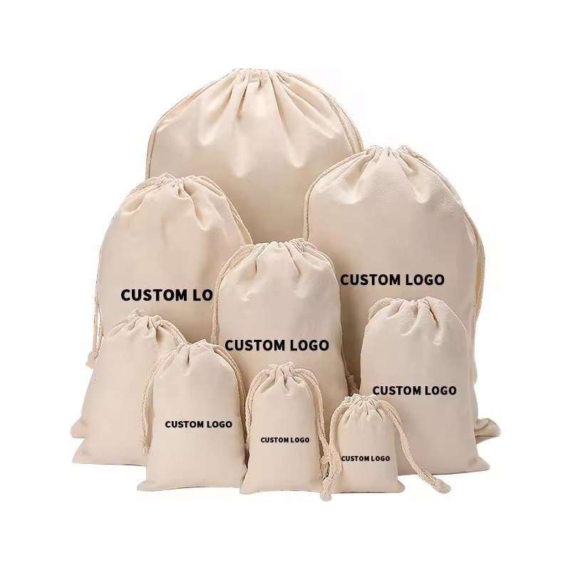Custom Logo Printed Eco Friendly Organic Muslin Cotton Pouch Promotional White Calico Cloth Packaging Canvas Drawstring Bag