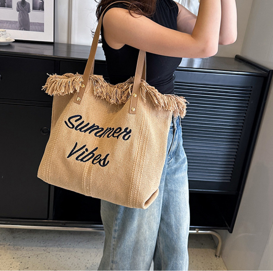 Item Name | Wholesale designer PU handle Large Capacity custom logo embroidery tassel cotton canvas beach tote bags with fringe |